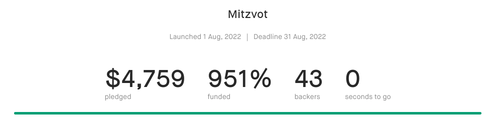Mitzvot was funded as a Kickstarter to help with the costs of cover art and publication. The campaign ended on August 30, 2022 and raised $4759 — 951% of the original goal.
